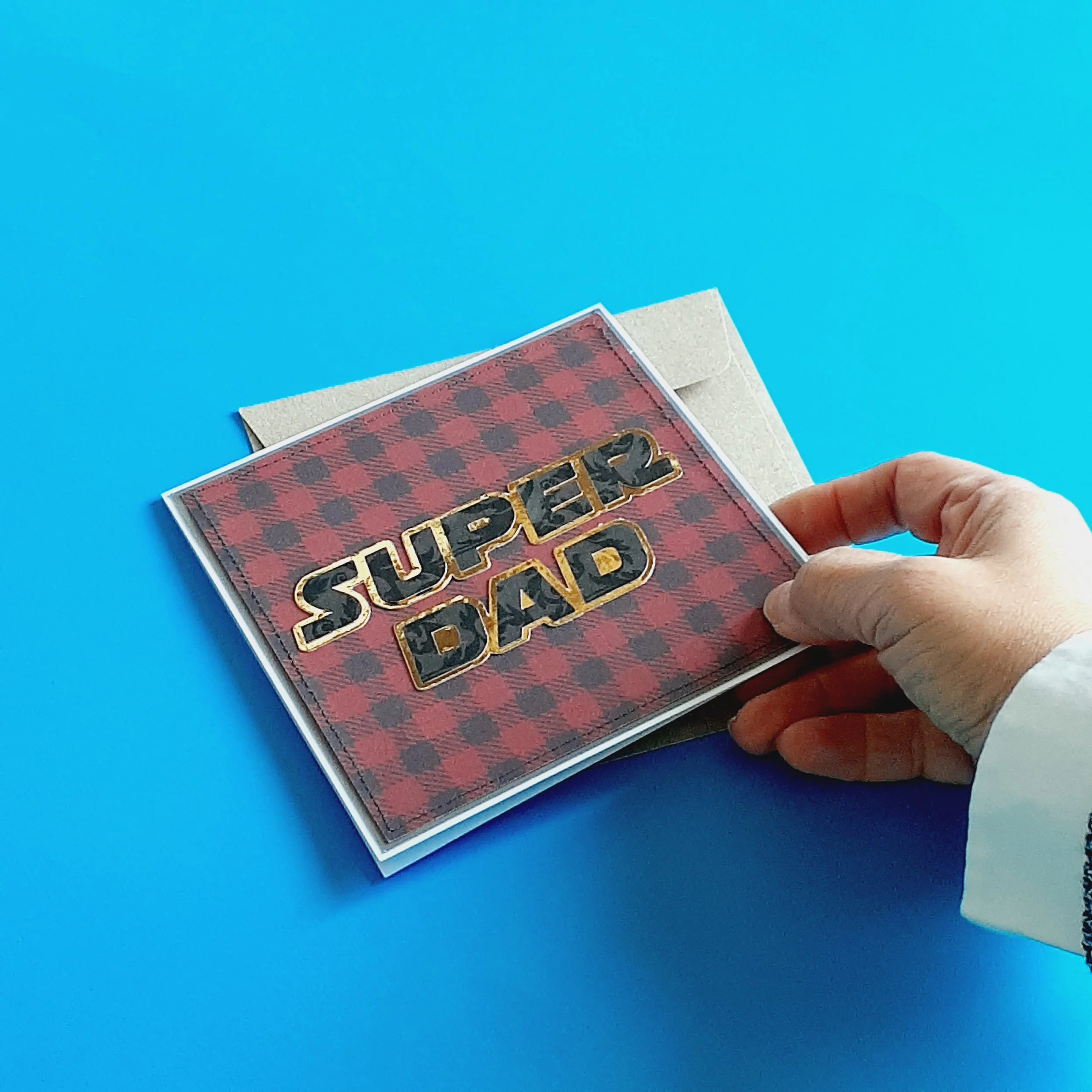 When everything's attached, adhere “Super Dad” at the center of the foreground square.